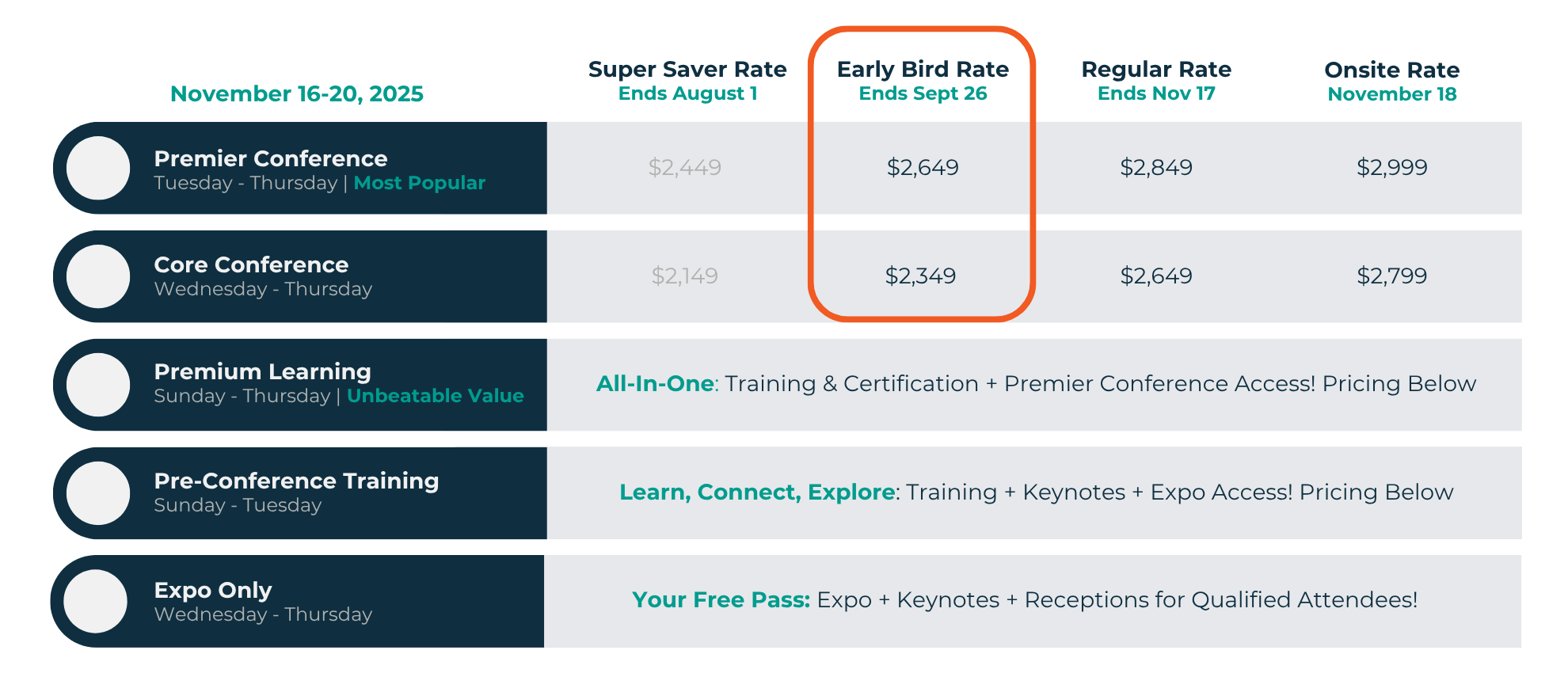 Choose a pass that fits your goals, schedule, and budget to optimize your conference experience. Options include Pre-Conference Training, one-day workshops, networking events, and informative sessions—all designed for your professional development. Every pass includes Expo Hall access, featuring receptions and networking, and access to our keynote presentations.